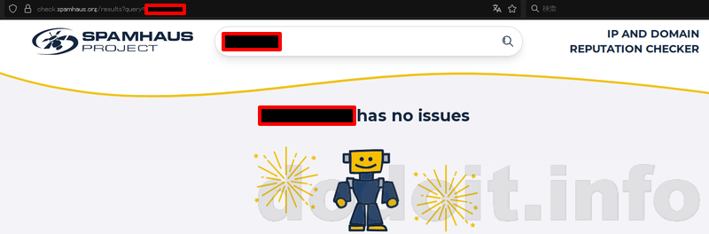 この『Spamhausのブラックリスト』というのはSpamhausのサイトでIPアドレスを入力すると確認出来るものです。