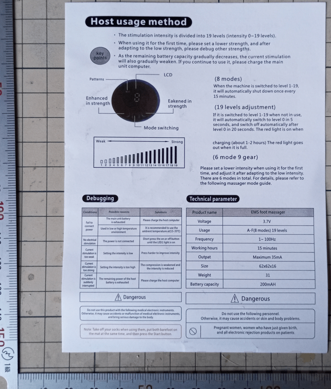 箱にも書いてありましたが、8つの動作モードと19段階(オフを含めると20段階)の強さが選択でき、モードも強さも変えずに連続動作させていると恐らく15分で自動的にオフになるものかと思います。15分のやつだけ長いので検証してません。
