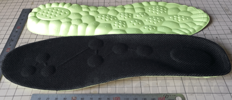 なお、今回のインソールは表面がザラザラしていて滑らなさそうなのですが、実際に履くと変に表面が凸凹しているせいかもしれませんが妙に滑る感じがするので、2枚のインソールの下側の方に埋めて使用しています。