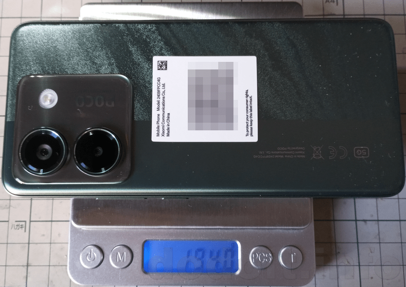 ただし、こちらはSIMカードが入っている状態でして、カタログ値では192gでしたので、なんだろ、POCO M7 Pro 5Gはカタログ値より実測で4gも重くてRedmi 12Cと逆転しているというのは、こっそり内部仕様がチェンジされているんでしょうかね?